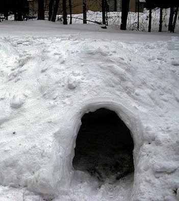 Find a snow bank, about four feet high; maybe something off to the left of the sidewalk your dad snowplowed this morning before going to work. Pull your mittens up tight and start digging at about a foot below the top of the bank. (A foot is a safe bet for a roof. Shouldn’t collapse.) Dig like a dog burying a bone, but make sure the snow doesn’t land back on the sidewalk. (You do NOT want that lecture.) Clear a space about four-by-three feet, that should be big enough. Now, round the roof into a dome, high enough so you won’t feel closed in. (Remember how claustrophobic you are, even at ten years old.)