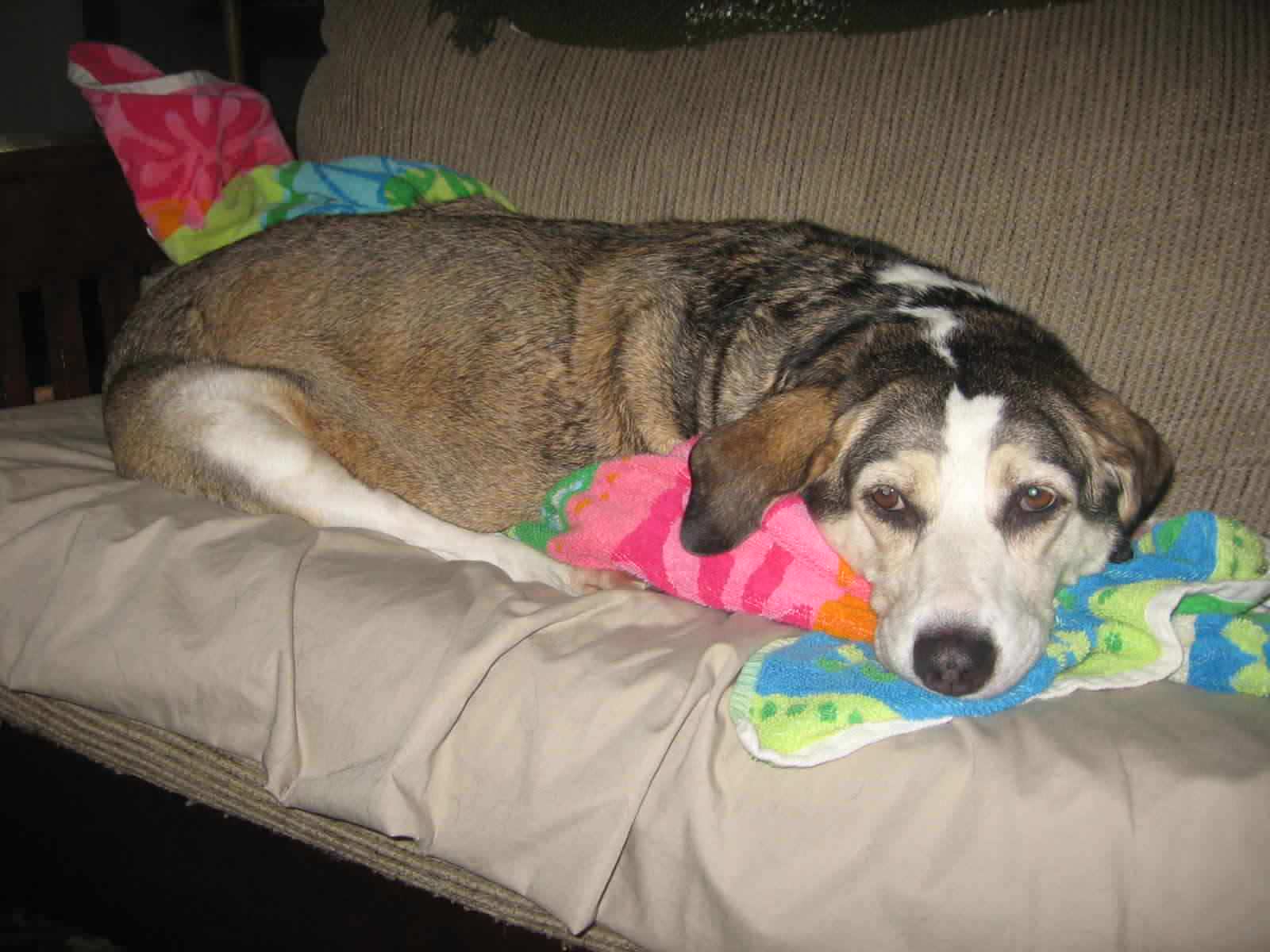Ten-year-old Mathilda woke up this morning paralyzed in her hind legs. This afternoon she was sedated, x-rayed and examined thoroughly by our vet. She needs to spend the night at the animal hospital, and be fed morphine and steroids in hopes that tomorrow she’ll walk again.