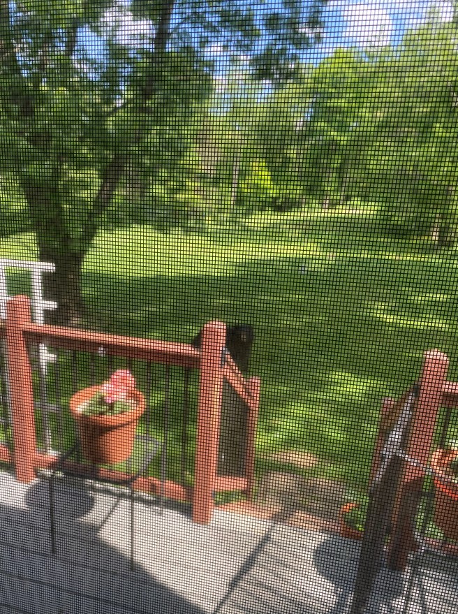 It was a lovely day; I’d opened the windows and the side storm door, which creates a nice cross breeze since the screen door facing the outside is fully screened. I was reading a book in my bedroom. Zuzu was asleep on the bed. Jim was in town visiting his parents. I was just about to drift off to sleep when I heard what sounded like someone knocking on the screen door. Why would someone come to the deck and not the front? I wondered, annoyed. I stood up to see who it was. I don’t have a bra on, I’m not in the mood for company…