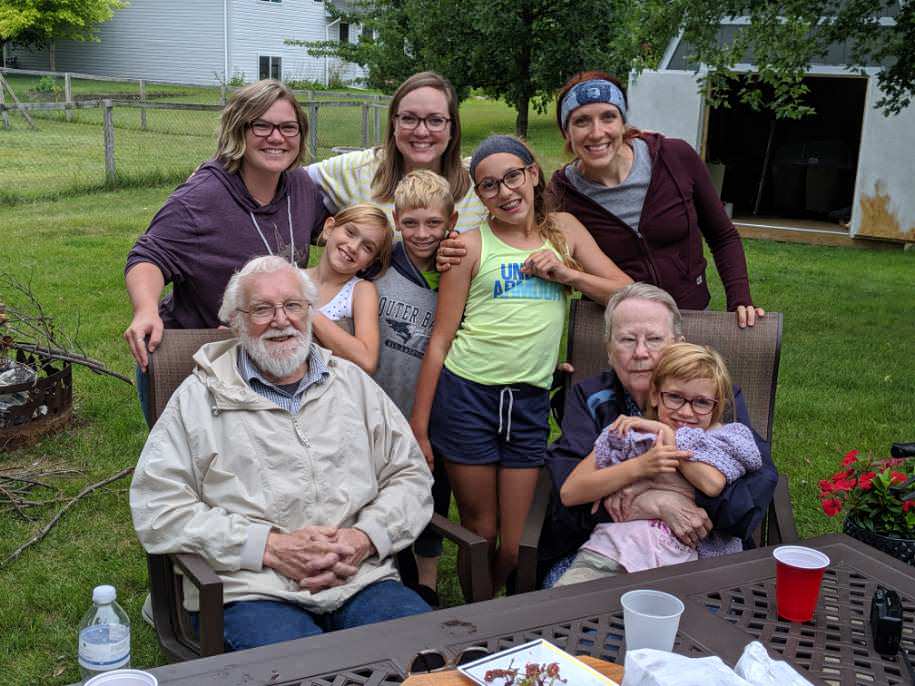 Dad with his great-grandkids and some of his grands, 2019.